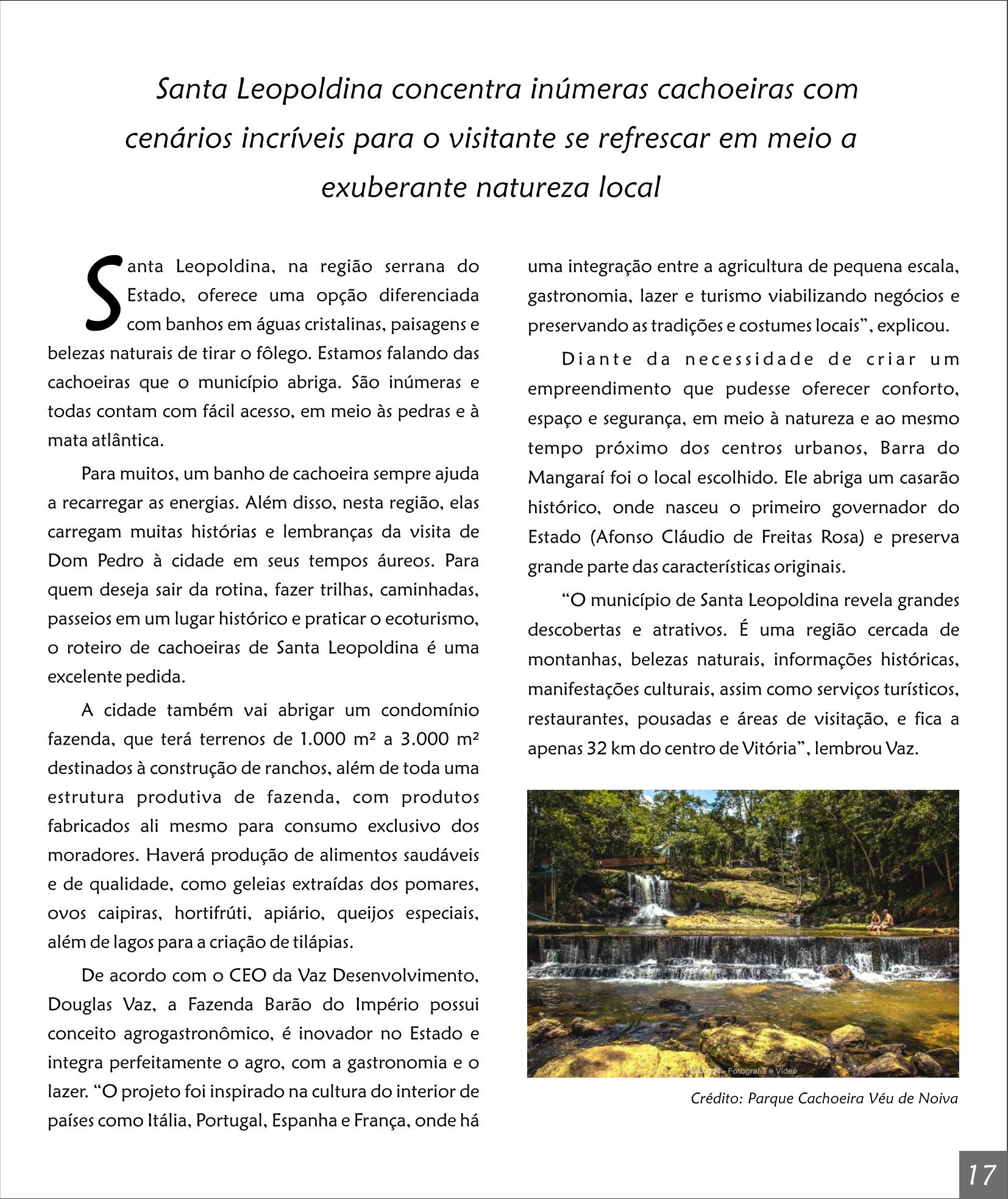 “O município de Santa Leopoldina revela grandes descobertas e atrativos. É uma região cercada de montanhas, belezas naturais, informações históricas, manifestações culturais, assim como serviços turísticos, restaurantes, pousadas e áreas de visitação, e fica a apenas 32 km do centro de Vitória”, lembrou Vaz.