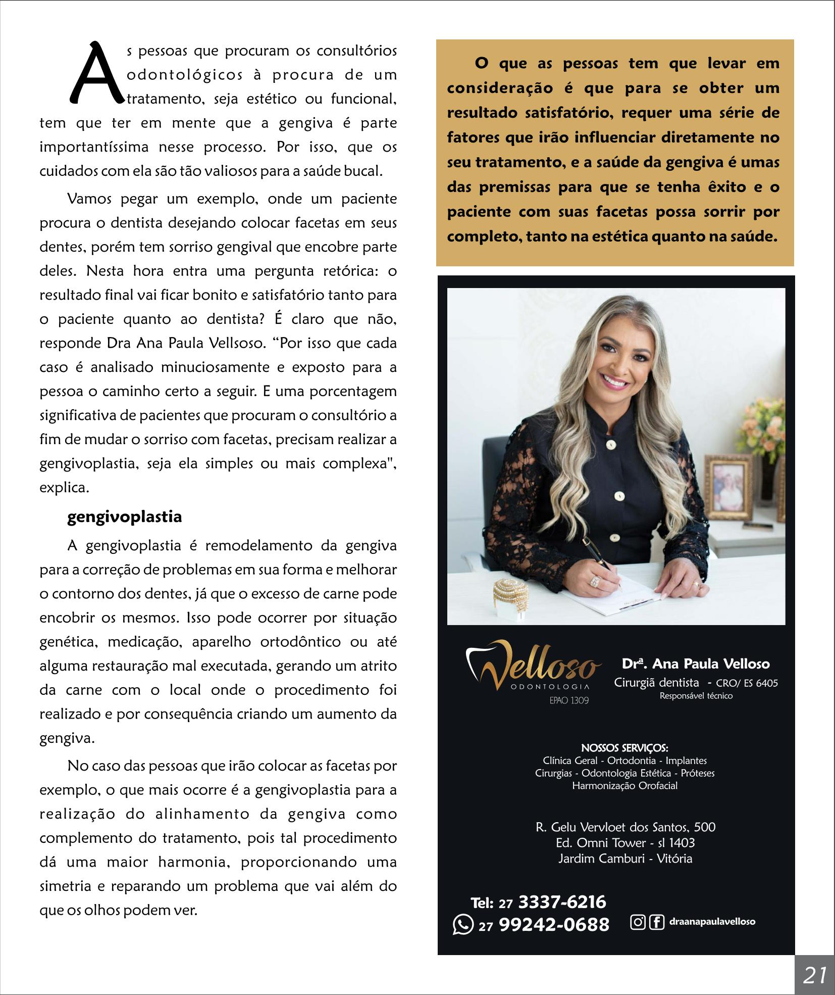 Vamos pegar um exemplo, onde um paciente procura o dentista desejando colocar facetas em seus dentes, porém tem sorriso gengival que encobre parte deles. Nesta hora entra uma pergunta retórica: o resultado final vai ficar bonito e satisfatório tanto para o paciente quanto ao dentista? É claro que não, responde Dra Ana Paula Vellsoso. “Por isso que cada caso é analisado minuciosamente e exposto para a pessoa o caminho certo a seguir. E uma porcentagem significativa de pacientes que procuram o consultório a fim de mudar o sorriso com facetas, precisam realizar a gengivoplastia, seja ela simples ou mais complexa'', explica.