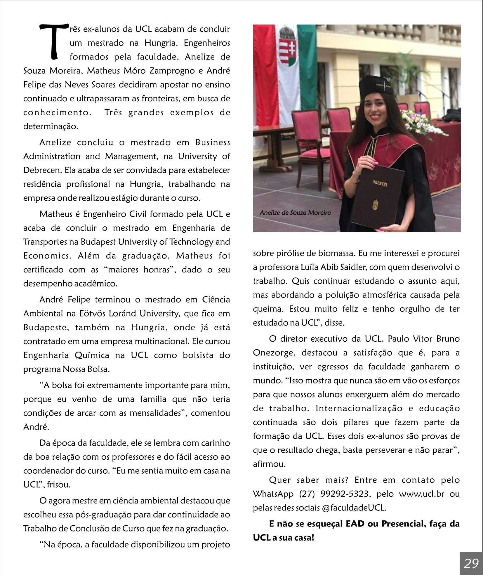 Três ex-alunos da UCL acabam de concluir um mestrado na Hungria. Engenheiros formados pela faculdade, Anelize de Souza Moreira, Matheus Móro Zamprogno e André Felipe das Neves Soares decidiram apostar no ensino continuado e ultrapassaram as fronteiras, em busca de conhecimento. Três grandes exemplos de determinação.