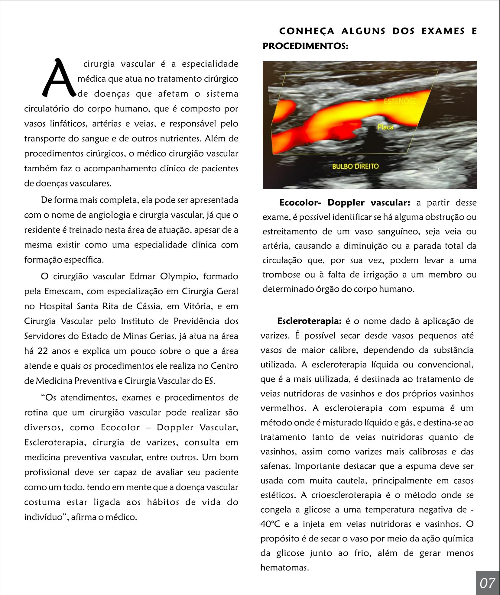 O cirurgião vascular Edmar Olympio, formado pela Emescam, com especialização em Cirurgia Geral no Hospital Santa Rita de Cássia, em Vitória, e em Cirurgia Vascular pelo Instituto de Previdência dos Servidores do Estado de Minas Gerias, já atua na área há 22 anos e explica um pouco sobre o que a área atende e quais os procedimentos ele realiza no Centro de Medicina Preventiva e Cirurgia Vascular do ES.